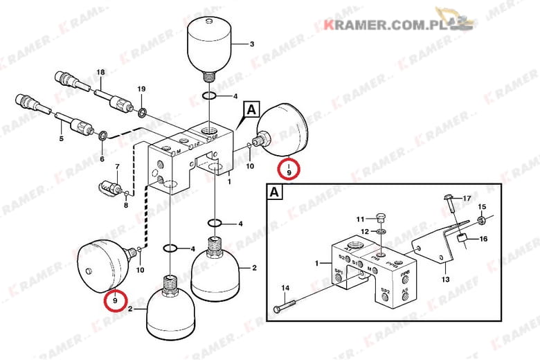 Akumulator gazowy stosowany w ładowarkach VOLVO: L90E, L70E, L60E, L50E, L150E, L180E, L150F, L180F, L90G.