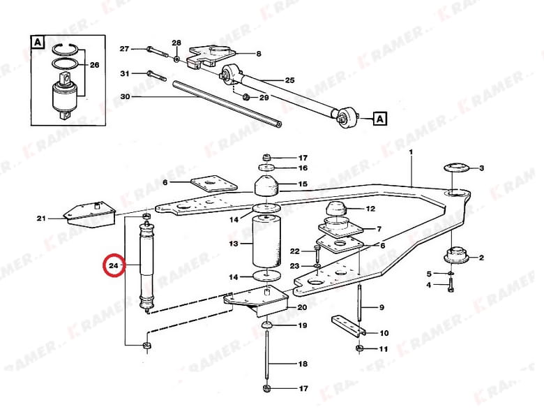 Amortyzator przedniej osi stosowany w wozidłach VOLVO A20C A25C A30 A30C A35 A35C A35D A35E A35F A35G A40 A40D A40E A40F A40G