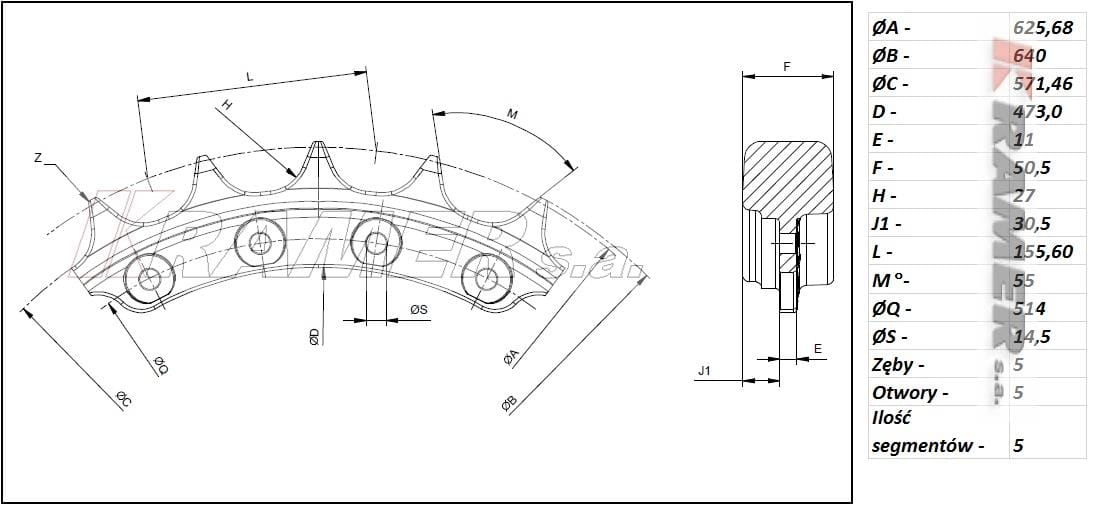 Skok (podziałka łańcucha) 155mm / 25 zębów / 25 otworów na śruby montażowe.