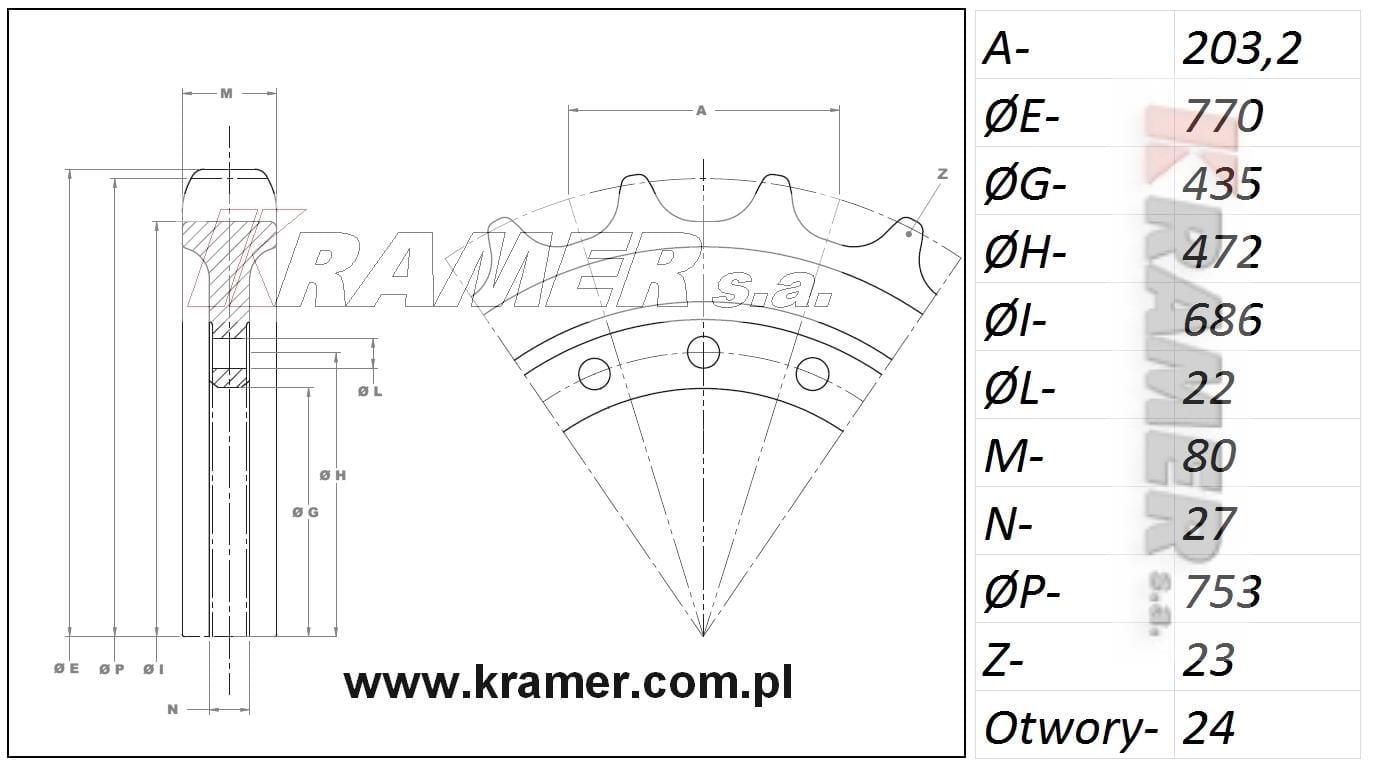 Skok 203mm / 23 zęby / 24 otworów fi=22mm / średnica osadzenia otworów: 472mm / piasta: 435mm / szer.80mm