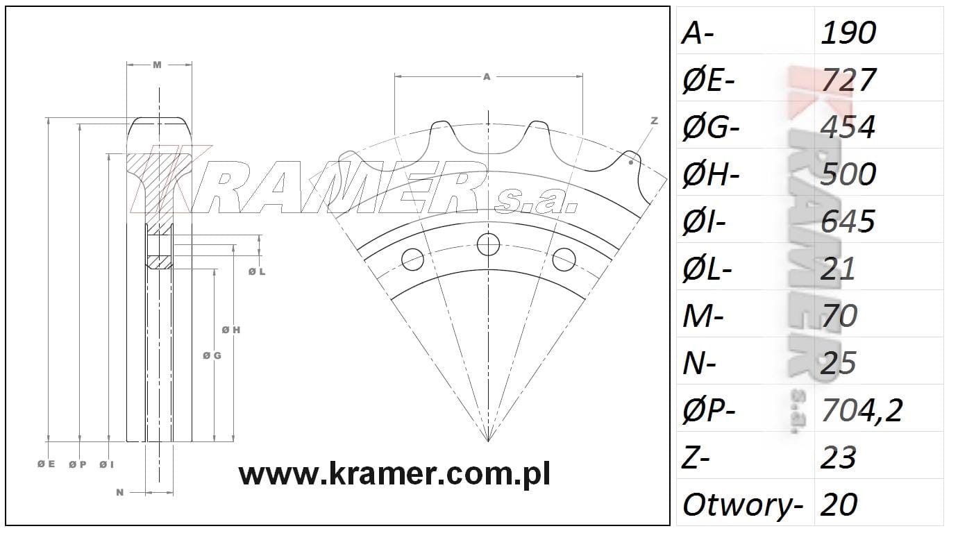 Skok 190mm / 23 zęby / 20 otworów fi=21mm / średnica osadzenia otworów: 500mm / piasta: 454mm / szer.70mm