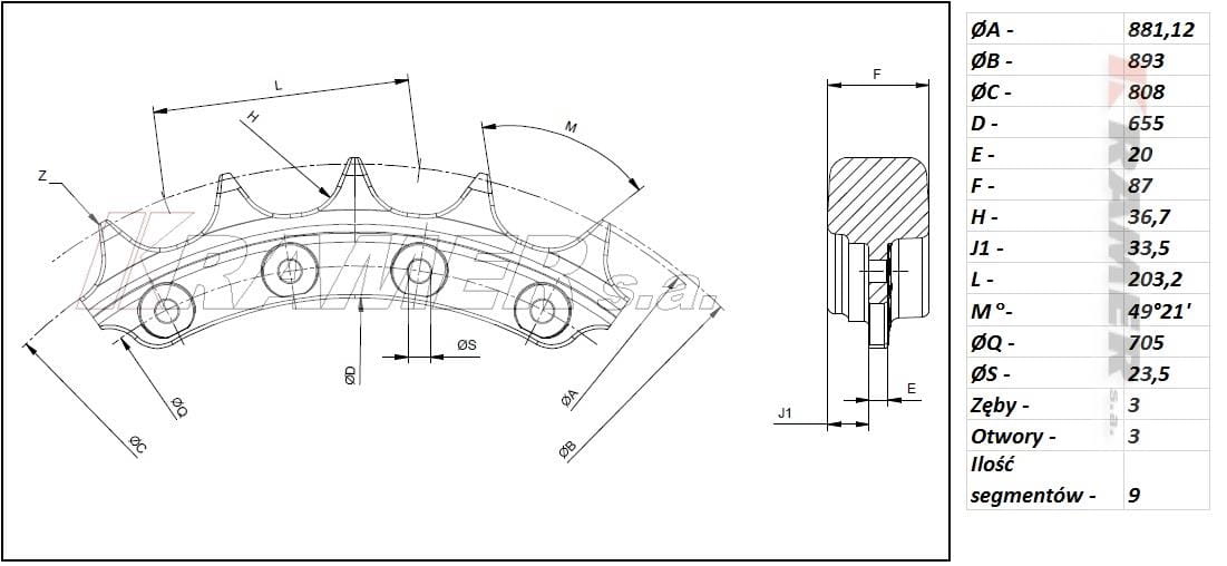 Skok (podziałka łańcucha) 203,2 mm / 27 zębów (9 segmentów po 3 zęby) / 27 otworów na śruby montażowe.