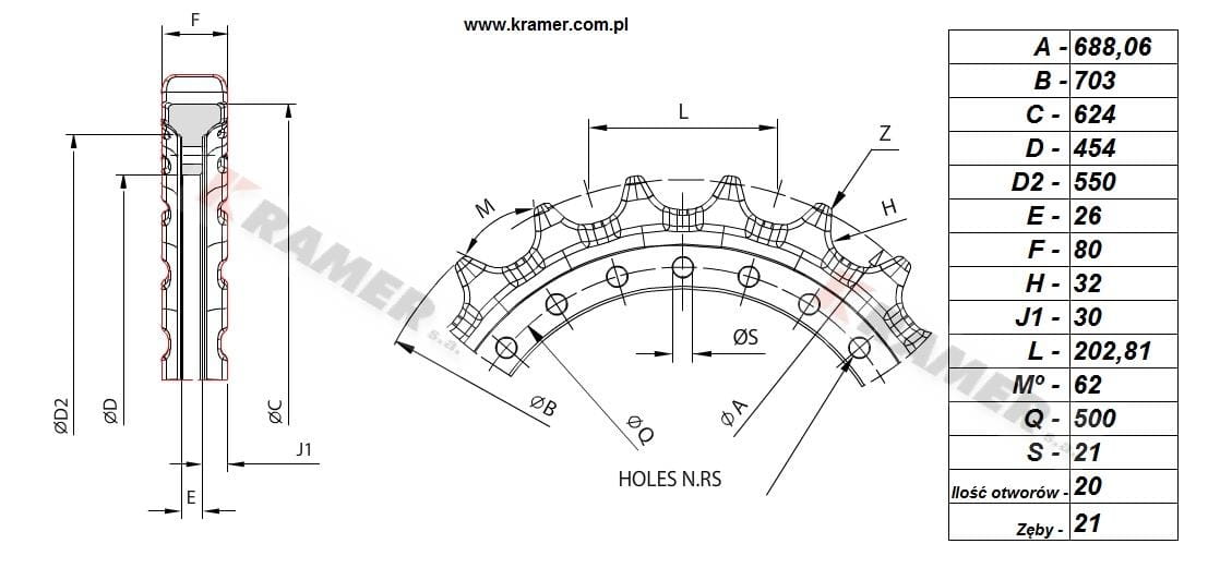 Skok 203 / 21 zębów / 20 otworów fi=21mm / piasta 454mm / średnica osadzenia otworów 500mm