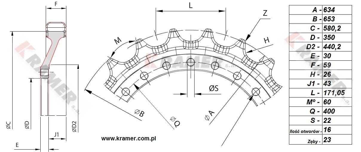 Skok ( podziałka ) 171,05mm / 23 zęby / 16 otworów fi=22mm / średnica osadzenia otworów: 400mm / piasta: 350mm / szerokość 59mm