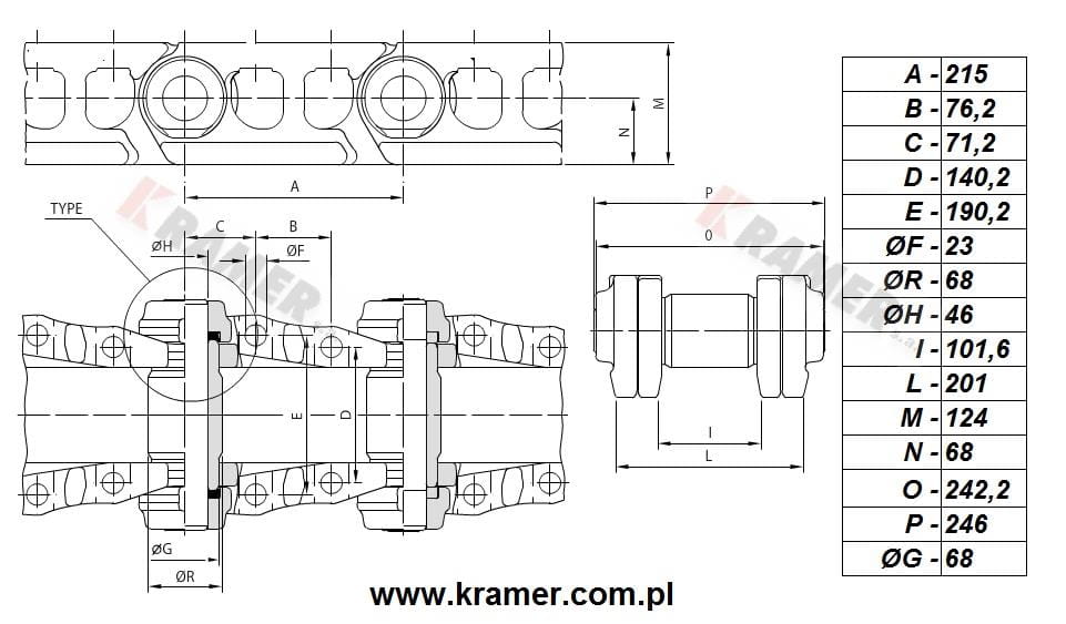 Łańcuch gąsienicy 49 ogniw uszczelniany wstępnie smarowany, zamykany sworzniem spinającym. Stosowany m.in. w koparkach CATERPILLAR 330 336, w szczególności w modelach :