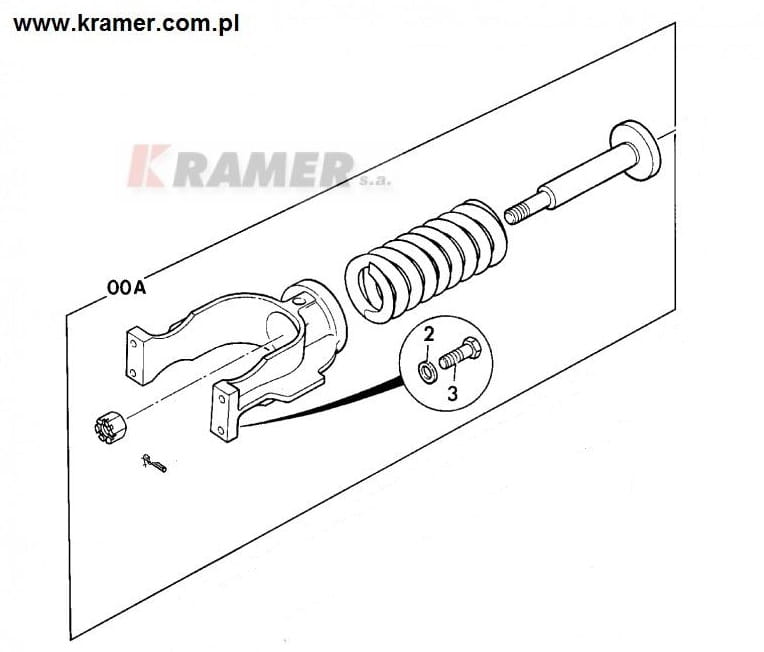 Zespół napinacza gąsienicy w skład którego wchodzą : sprężyna, napinacz, śruba, widełki do mocowania koła napinającego