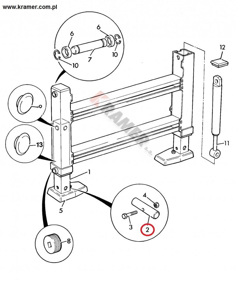 Sworzeń stabilizatora - dół. Służy do zamocowania łapy stabilizatora koparko-ładowarki