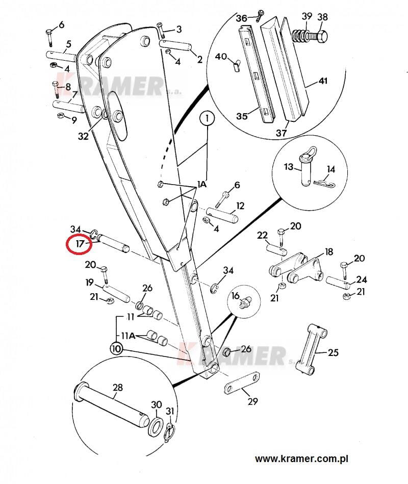 Sworzeń ramienia wysięgnika stosowany w koparko- ładowarkach
