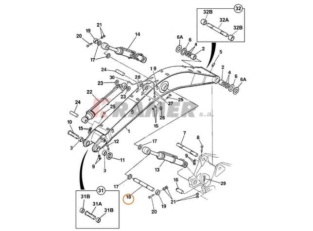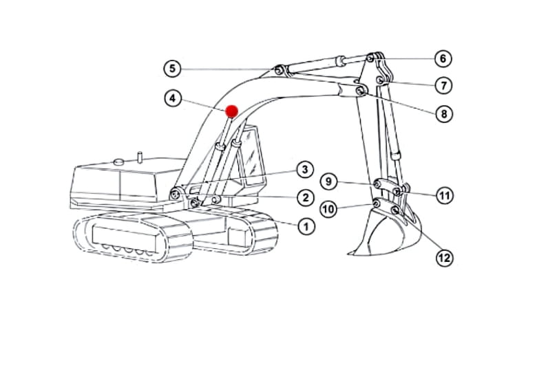 Sworzeń siłowników podnoszenia ramienia stosowany w koparkach JCB: JS115, JS130, JS145, JS115W, JS130W, JS145W.