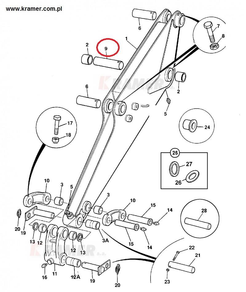 Sworzeń (174mm) wysięgu ramienia łyżki. Stosowany w maszynach JCB