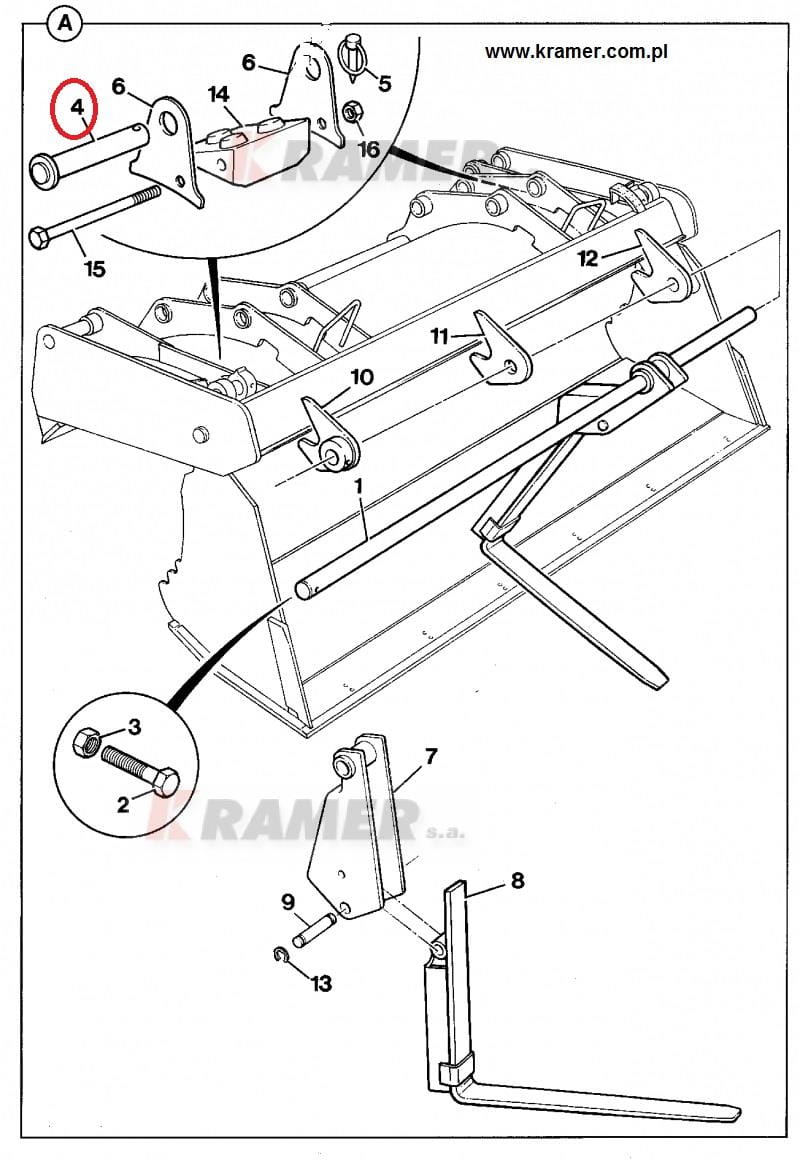 Sworzeń zabezpieczający widły na przedniej łyżce przed samoczynnym rozłożeniem. Zastosowanie: koparko-ładowarka