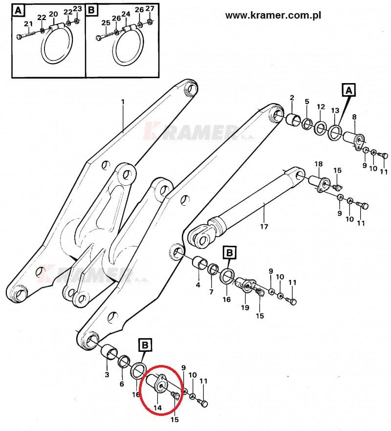 Sworzeń ramienia łyżki z kalamitką. Stosowany w ładowarkach VOLVO L180E i innych