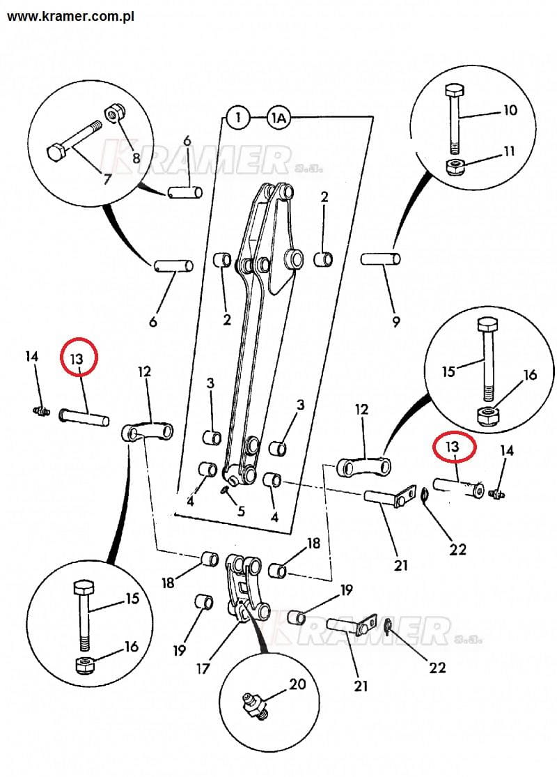 Sworzeń wysięgu ramienia dół stosowany w minikoparkach
