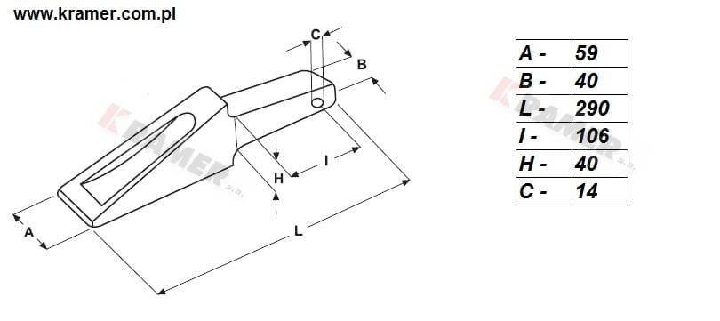 Ząb Bofors 4038208, przeznaczony do koparek o masie do 8000kg. Zabezpieczany horyzontalnie sworzniem 61708.