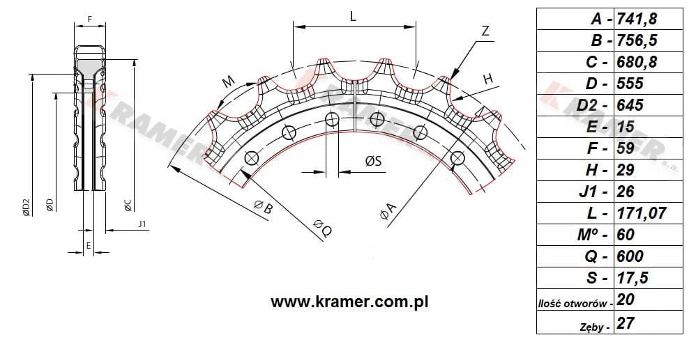 Skok ( podziałka ) 171mm / 27 zębów / 20 otworów fi=17,5mm / średnica osadzenia otworów: 600mm / piasta: 555mm / szerokość 59mm